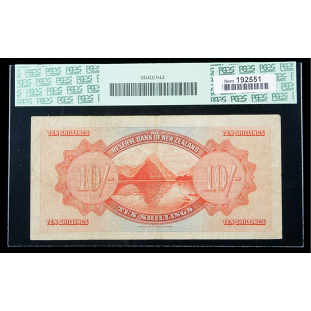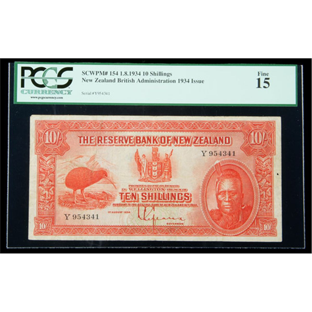 New Zealand SCWPM# 154, 1.8.1934 10 Shillings. PCGS Fine 15. . Fr-P-154. A second example of this scarce issue, lower grade but with no significant flaws save for normal signs of circulation.