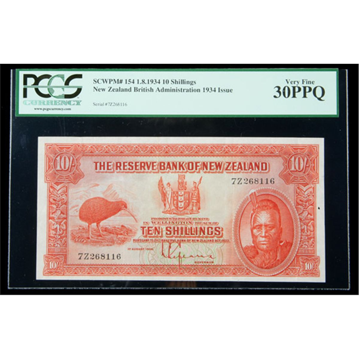 New Zealand SCWPM# 154, 1.8.1934 10 Shillings. PCGS Very Fine 30PPQ. . Fr-P-154. This is a beautiful and scarce mid-grade circulated example of a very popular issue. Other than the very rare 50 Pounds issue from the 1934 series, this is the scarcest denomination that is available to most collectors. When seen, most examples are low grade and many are damaged. This piece is an exception to the rule, with bold colors and no problems whatsoever for the grade. Certain to inspire spirited bidding, and we would not be surprised at all if our pre-sale estimate proves to be conservative in the extreme.