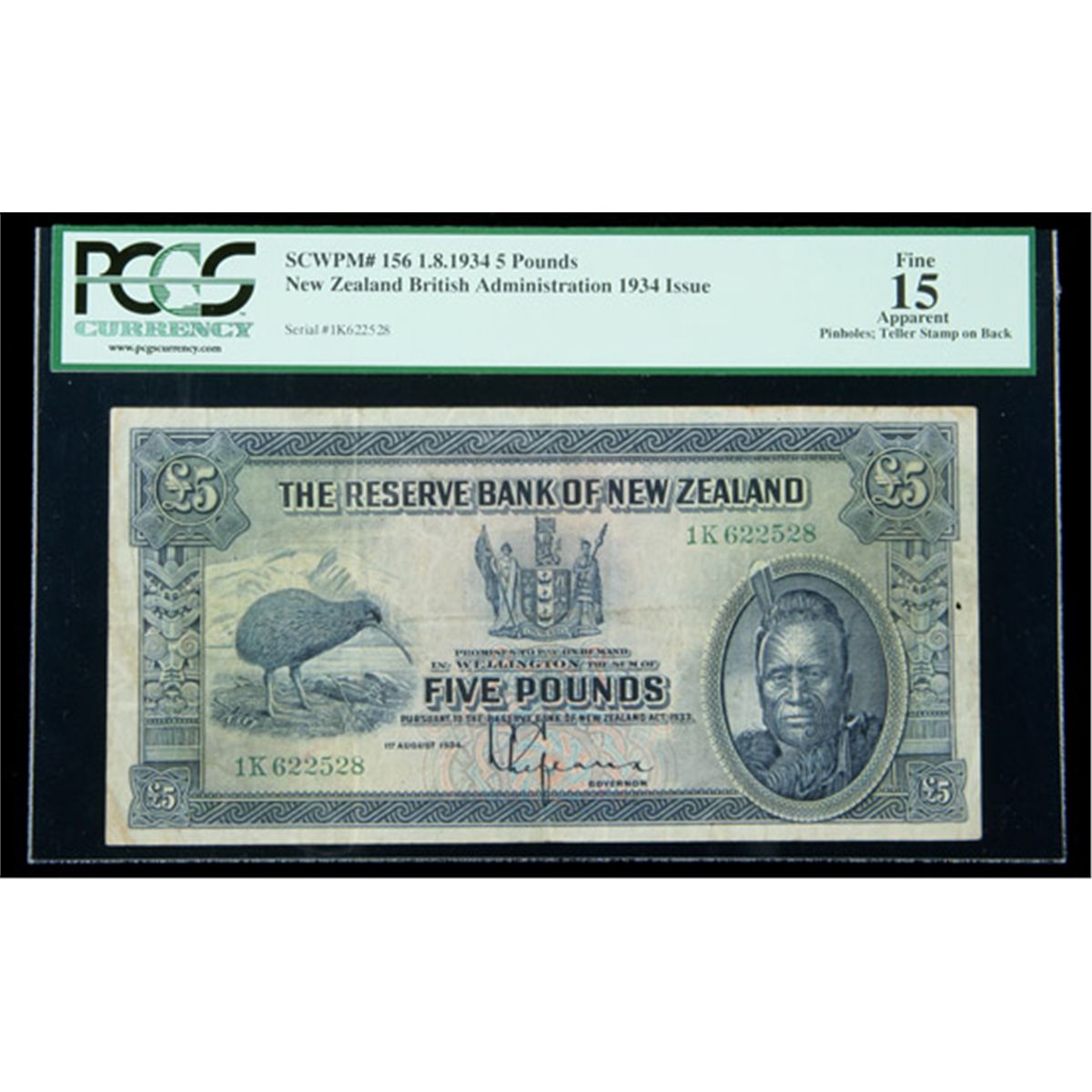 New Zealand SCWPM# 156, 1.8.1934 5 Pounds. PCGS Fine 15 Apparent. . Fr-P-156. A couple of minor flaws are present, listed by PCGS Currency on the grading label as "pinholes, teller stamp on back." A scarce note from a popular series, and desirable despite these minor flaws.