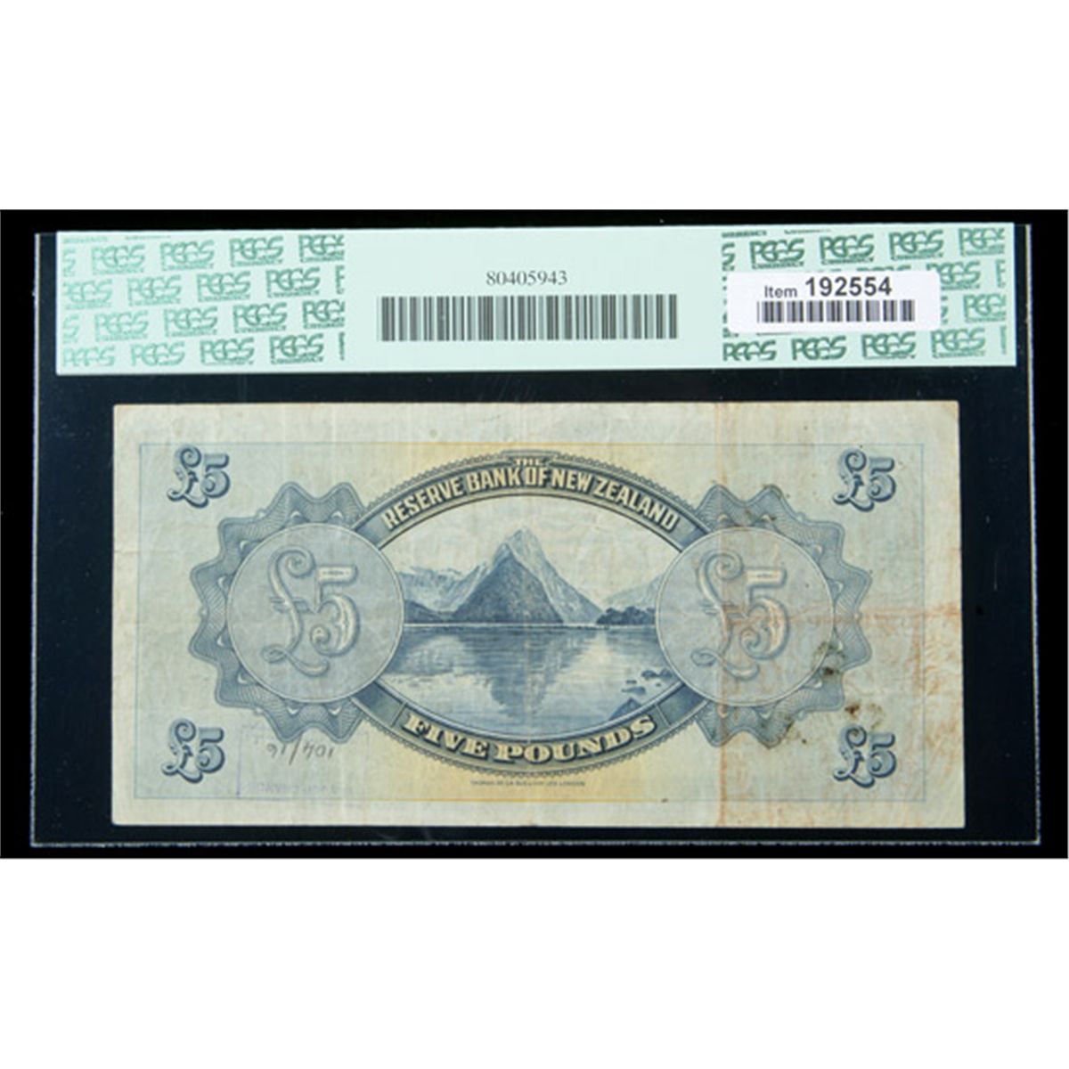 New Zealand SCWPM# 156, 1.8.1934 5 Pounds. PCGS Fine 15 Apparent. . Fr-P-156. A couple of minor flaws are present, listed by PCGS Currency on the grading label as "pinholes, teller stamp on back." A scarce note from a popular series, and desirable despite these minor flaws.
