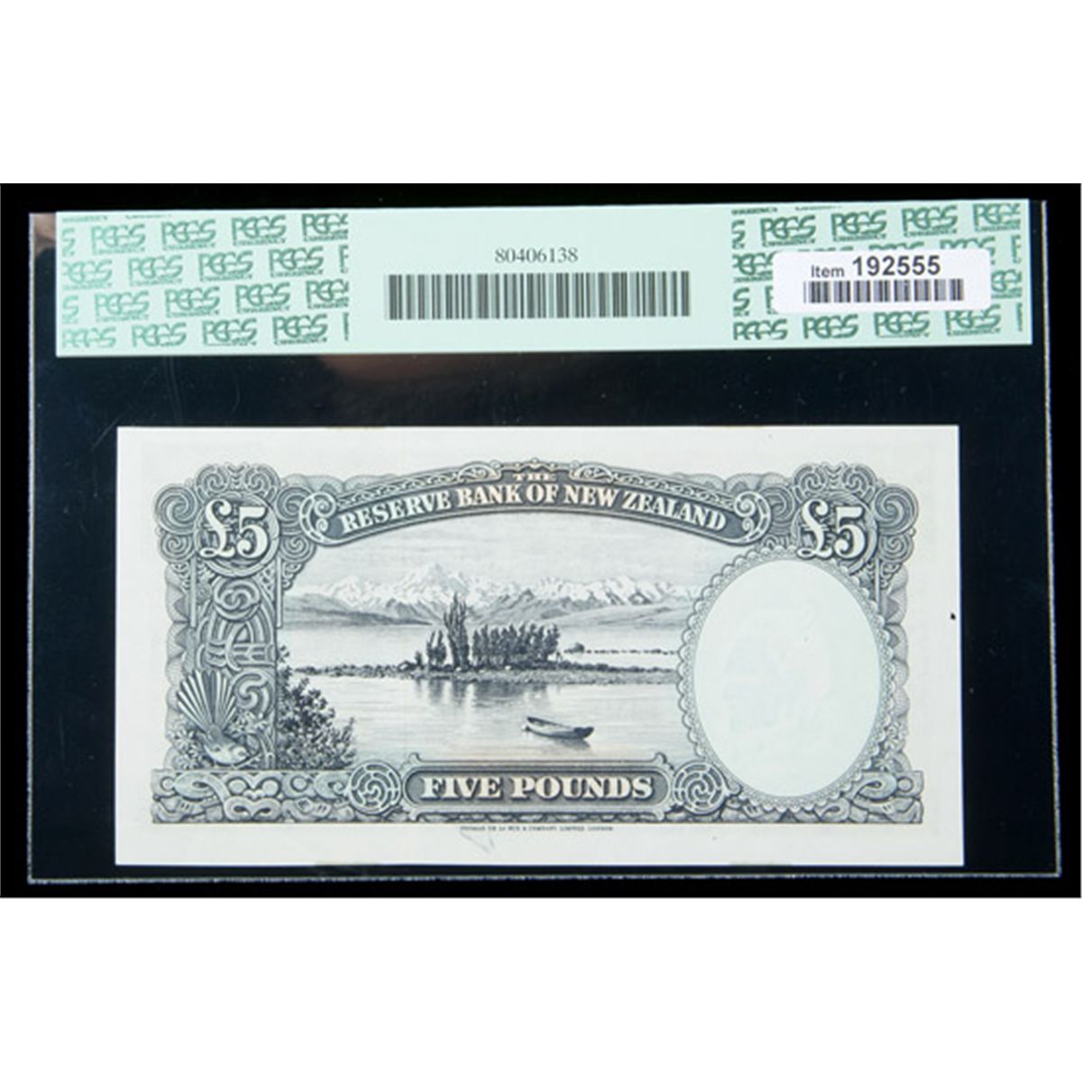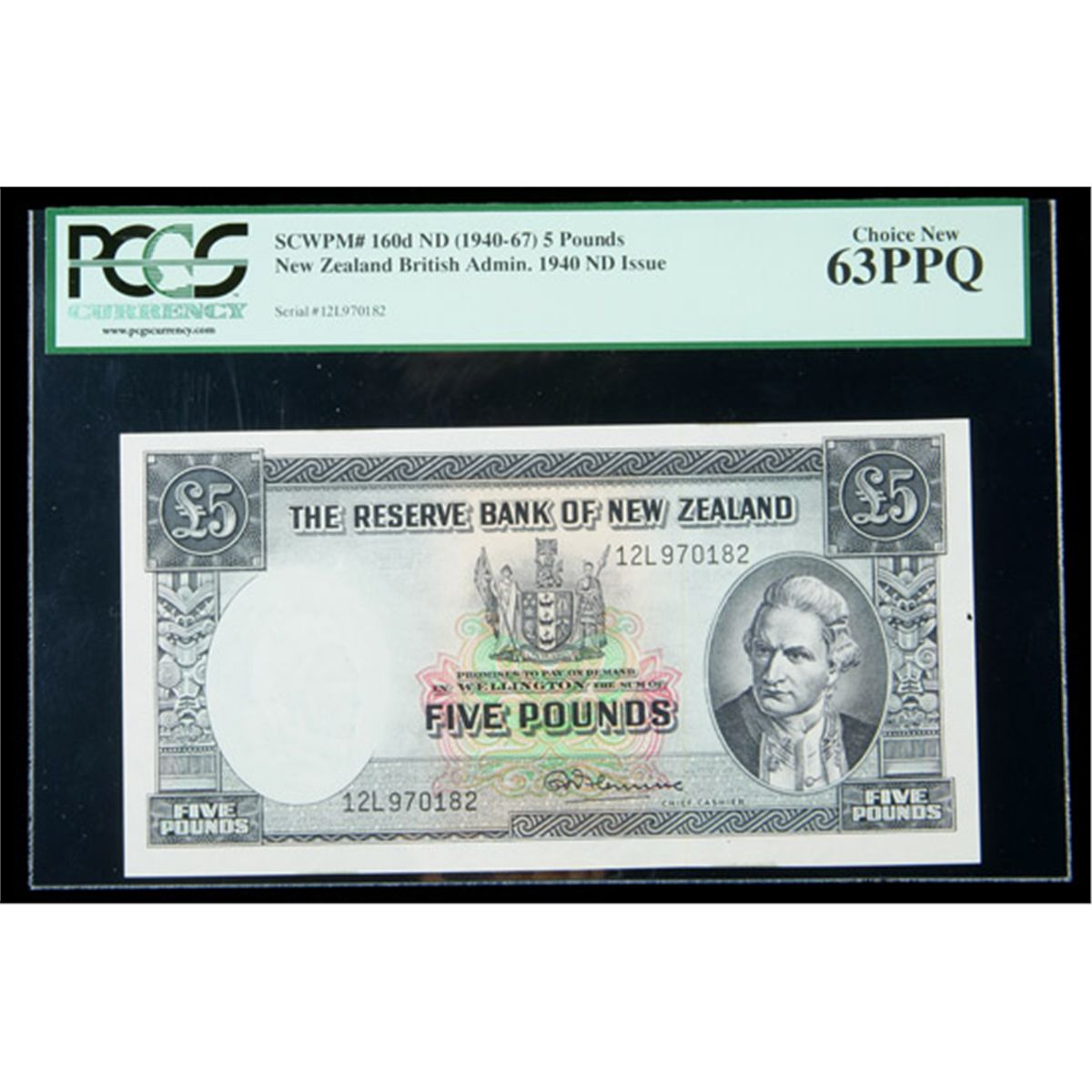 New Zealand SCWPM# 160d, ND (1940-67) 5 Pounds. PCGS Choice New 63PPQ. . Fr-P-160d. Some very minor edge bumps prevent a higher grade on this well preserved example.