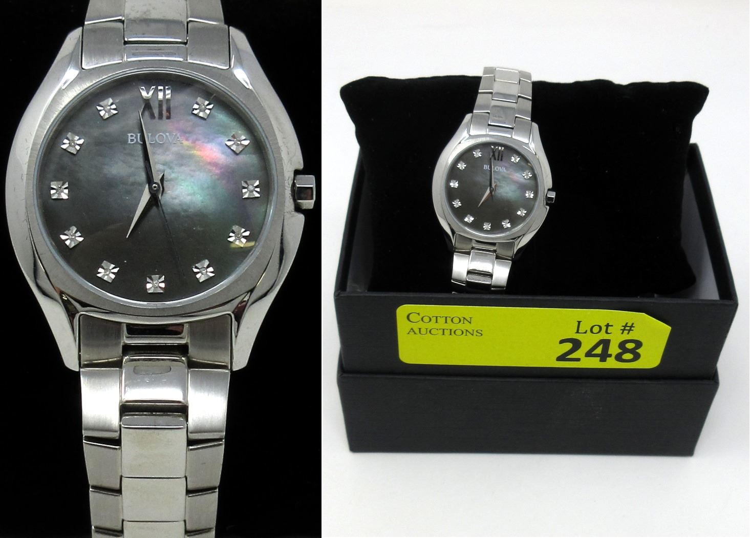 Set with 11 Diamonds. Black/ Noir Mother-of-Pearl dial. With Warranty card. Retail Value $700