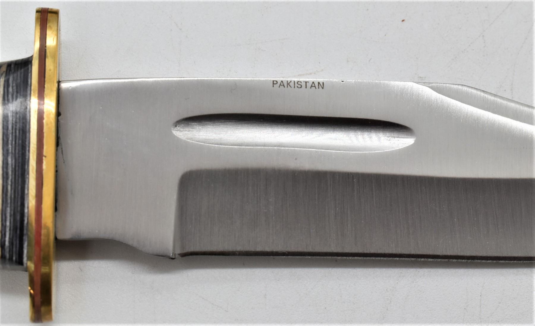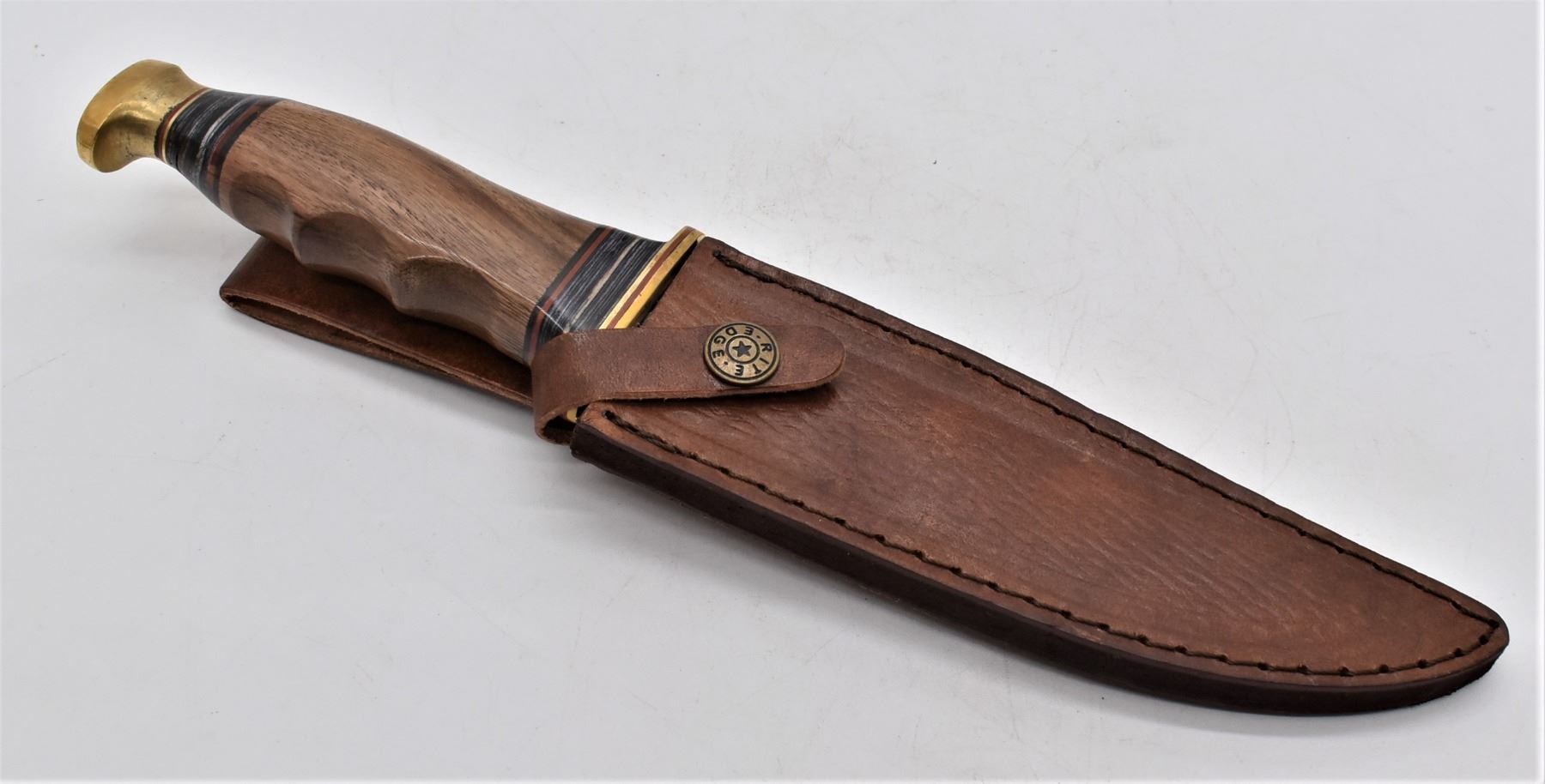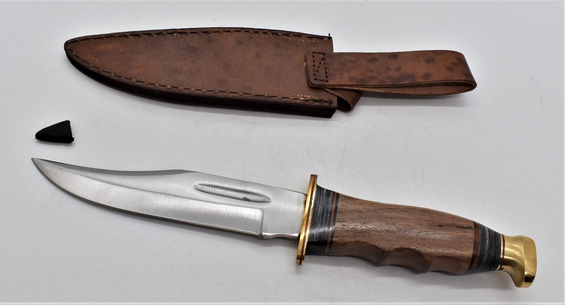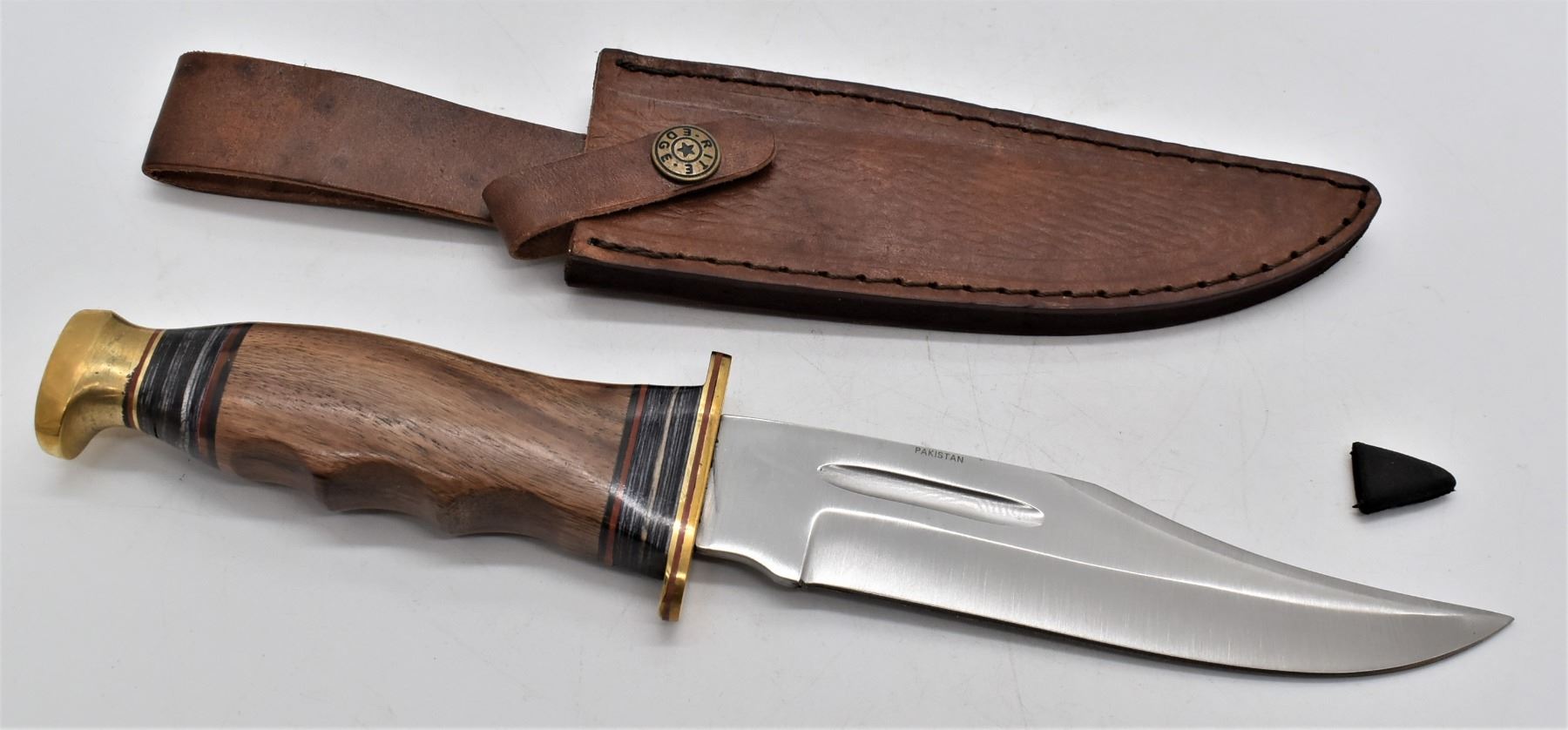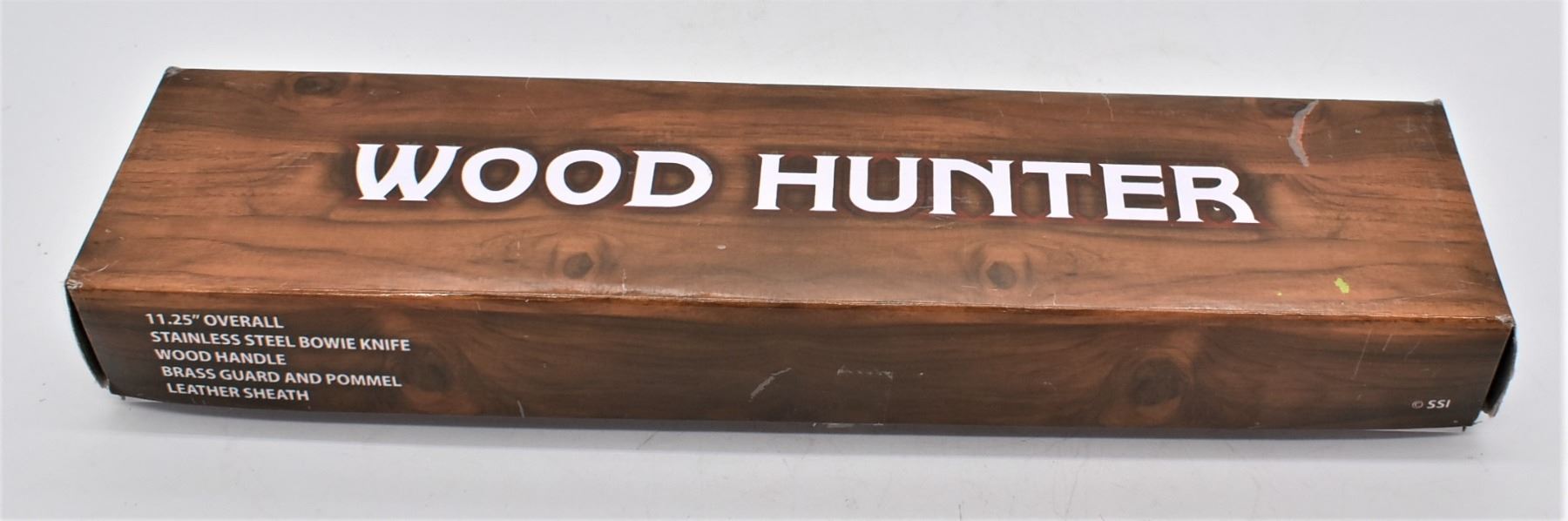 New in Box Wood Hunter Bowie Knife, comes with leather scabbard, wood handle measures 5''L, blade measures 6''L, stainless steel blade is marked Pakistan, brass hilt and pommel
