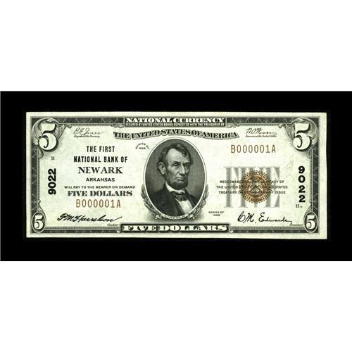 <B>Newark, AR</B></I> - $5 1929 Ty. 1 <B>The First NB</B></I> Ch. # 9022<BR>A scarce and lovely serial number 1 example from a sheet which was cut almost two decades ago. After a few appearances in 1991, these notes were dispersed, and no number 1 example from here has been available at public sale since 1993. <B>Gem Crisp Uncirculated.</B></I><BR><BR><b>Shipping:</b> Coin/Currency (<a target="_blank" href="http://www.heritageauctions.com/common/shipping.php">view shipping information</a>)