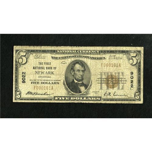 <B>Newark, AR</B></I> - $5 1929 Ty. 1 <B>The First NB</B></I> Ch. # 9022<BR>A bit of margin roughness just started to set in before this piece from a tough bank was plucked from circulation. <B>Very Good.</B></I><BR><BR><b>Shipping:</b> Coins & Currency (<a target="_blank" href="http://www.heritageauctions.com/common/shipping.php">view shipping information</a>)