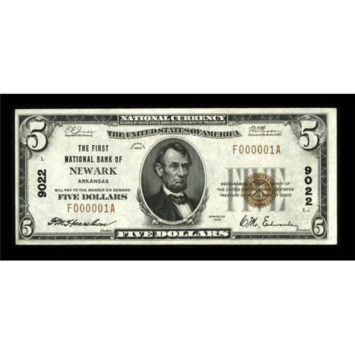<B>Newark, AR</B></I> - $5 1929 Ty. 1 <B>The First NB</B></I> Ch. # 9022<BR> A lovely serial number 1 example from this none too common bank, the only issuer in this small community. This piece is fully Choice save for one very insignificant corner fold which is well outside the design. <B>Crisp Uncirculated, </B></I>a premium example certain to please its fortunate new owner. <BR><BR><b>Shipping:</b> Coins & Currency (<a target="_blank" href="http://www.heritageauctions.com/common/shipping.php">view shipping information</a>)