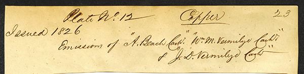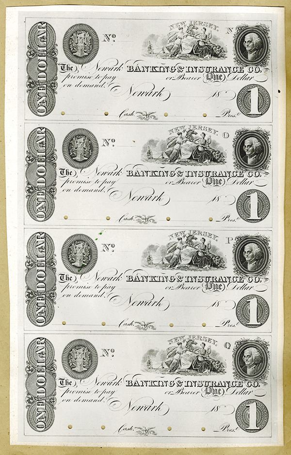 Newark, New Jersey. 18xx (ca.1820's). This sheet of proofs are from a later 1860's printing from the original copper plates for archival purposes. Plates N-O-P-Q. Printed on India paper, mounted on original card and affixed to brown paper scrapbook page. Handwritten text on top of manila page states "Plate No.12 - Copper - Issued 1826"...."Emissions of "A. Beach Cash." "Wm.M.Vermilye Cash." & "J.D.Vermilye Cash". A similar sheet was in the 1990 ABN auction but it has probably been cut up since then. Very possibly unique as sheet. Excellent condition with slightly wavey paper, otherwise Uncirculated. Printed originally by Fairman, Draper, Underwood & Co. with this sheet printed by ABNC as part of their archival record. (Ex-Stacks "Philadelphia Americana Sale" from October 2009).
