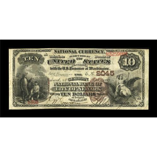 <B>Newark, NJ</B></I> - $10 1882 Brown Back Fr. 485 <B>The German NB</B></I> Ch. # 2045<BR> An exceptionally rare Newark note which traces its pedigree to the December, 1983 Hickman-Oakes sale, where it was lot 192. In that sale John noted that he knew of only one other note with this title. Interestingly, in the quarter century that followed just two other notes with this title have surfaced, both First Charters, and, like the one other reported First Charter from here, appallingly low grade. This piece, available for the first time in nearly twenty five years, is a happy exception, grading <B>Fine-Very Fine</B></I> with good color and strong pen signatures. Expect some serious competition before the hammer falls on this lot tonight. <BR><I>From The John Ameen Collection</B></I><BR><BR><b>Shipping:</b> Coins & Currency (<a target="_blank" href="http://www.heritageauctions.com/common/shipping.php">view shipping information</a>)