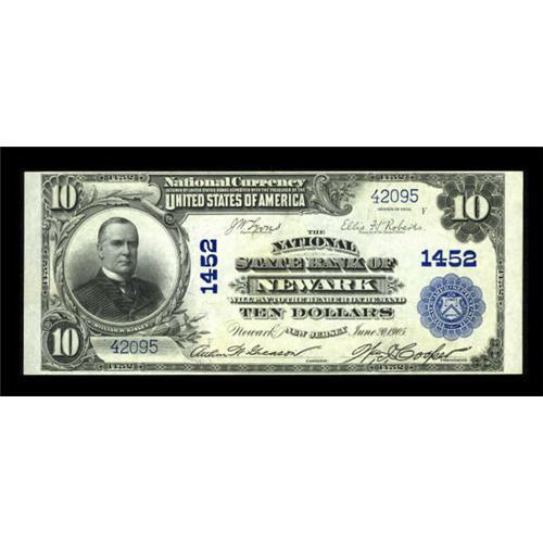 <B>Newark, NJ</B></I> - $10 1902 Plain Back Fr. 624 <B>The National State Bank</B></I> Ch. # 1452<BR> While not a rare Newark issuer, examples in this state of preservation are virtually impossible to find, with this piece and one First Charter five the only notes in the Kelly census listed in CU condition. Lovely <B>Choice Crisp Uncirculated,</B></I> with bright white paper, vivid inks, and strong signatures. <BR><I>From The John Ameen Collection</B></I><BR><BR><b>Shipping:</b> Coins & Currency (<a target="_blank" href="http://www.heritageauctions.com/common/shipping.php">view shipping information</a>)