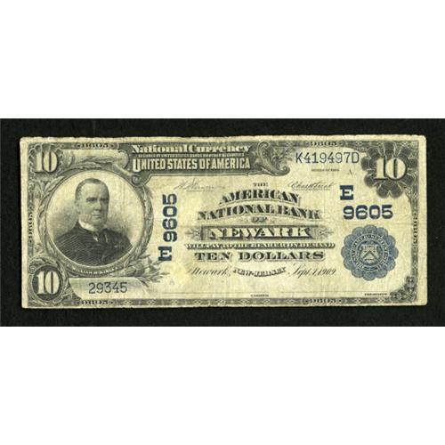 <B>Newark, NJ</B></I> - $10 1902 Plain Back Fr. 626 <B>The American NB</B></I> Ch. # (E)9605<BR> This piece is well circulated but from a less common Newark bank. <B>Very Good.</B></I><BR><BR><b>Shipping:</b> Coins & Currency (<a target="_blank" href="http://www.heritageauctions.com/common/shipping.php">view shipping information</a>)
