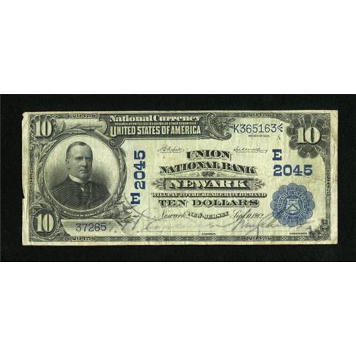 <B>Newark, NJ - </B></I>$10 1902 Plain Back Fr. 628<B> Union NB</B></I> Ch. # (E)2045<BR> This bank succumbed to the pressures of its depositors and changed its name due to anti-German influences stemming from WWI. <B>Fine</B></I>.<BR><I>From The John Ameen Collection</B></I><BR><BR><b>Shipping:</b> Coins & Currency (<a target="_blank" href="http://www.heritageauctions.com/common/shipping.php">view shipping information</a>)