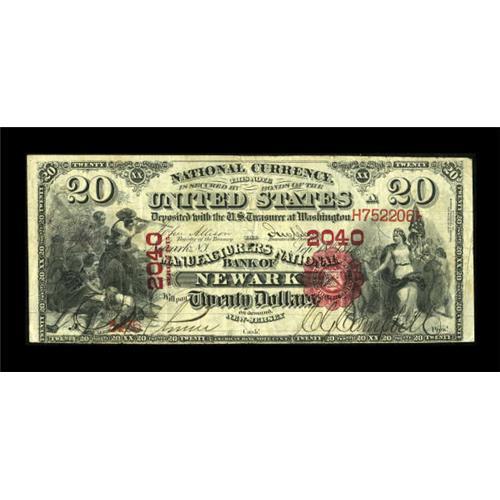 <B>Newark, NJ</B></I> - $20 1875 Fr. 431 <B>The Manufacturers NB</B></I> Ch. # 2040<BR> Another rare New Jersey type, with this piece making its first appearance at public sale in thirty years. There are a few pinholes and one small body hole at the title, but the colors and overall appearance, especially on the front, are those of a considerably higher grade example. <B>Fine-Very Fine,</B></I> a type and denomination which has virtually disappeared from today's marketplace. <BR><I>From The John Ameen Collection</B></I><BR><BR><b>Shipping:</b> Coins & Currency (<a target="_blank" href="http://www.heritageauctions.com/common/shipping.php">view shipping information</a>)