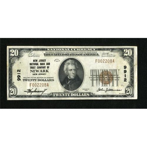 <B>Newark, NJ</B></I> - $20 1929 Ty. 1 <B>The Broad & Market NB & TC</B></I> Ch. # 9912<BR> This is a nicely margined and bright representative from this New York City neighbor. <B>Very Fine-Extremely Fine.<BR></B></I><I>From The John Ameen Collection</B></I><BR><BR><b>Shipping:</b> Coins & Currency (<a target="_blank" href="http://www.heritageauctions.com/common/shipping.php">view shipping information</a>)