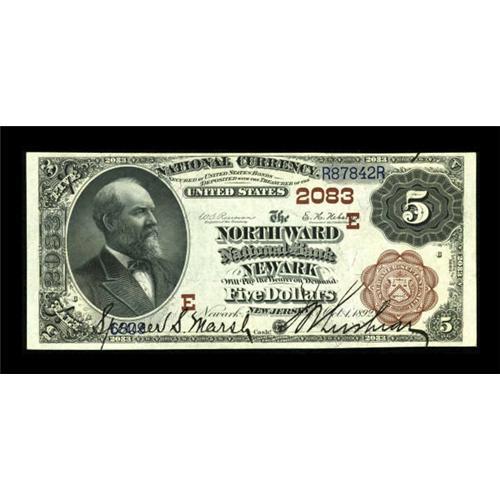 <B>Newark, NJ</B></I> - $5 1882 Brown Back Fr. 472 <B>The North Ward NB</B></I> Ch. # (E)2083<BR> A lovely $5 Brown Back which is tied with one other note for "Finest Known" in the census from here. <B>Extremely Fine-About Uncirculated,</B></I> a premium example with loads of eye appeal. <BR><I>From The John Ameen Collection</B></I><BR><BR><b>Shipping:</b> Coins & Currency (<a target="_blank" href="http://www.heritageauctions.com/common/shipping.php">view shipping information</a>)