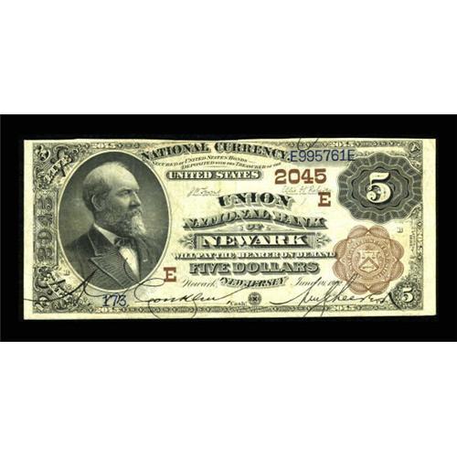 <B>Newark, NJ</B></I> - $5 1882 Brown Back Fr. 477 <B>Union NB</B></I> Ch. # (E)2045<BR> A high grade $5 Brown Back bearing this bank's second title. Nice <B>Very Fine.</B></I><BR><I>From The John Ameen Collection</B></I><BR><BR><b>Shipping:</b> Coins & Currency (<a target="_blank" href="http://www.heritageauctions.com/common/shipping.php">view shipping information</a>)