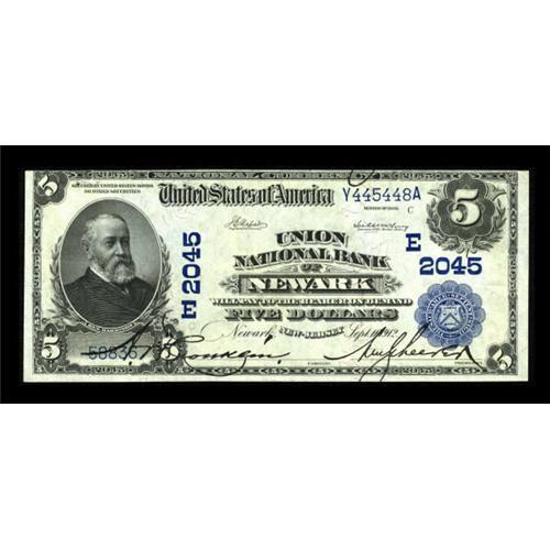 <B>Newark, NJ</B></I> - $5 1902 Date Back Fr. 594 <B>Union NB</B></I> Ch. # (E)2045<BR> A high grade piece which was obtained by our consignor as lot 177 in the April, 1983 Hickman-Oakes sale. <B>Extremely Fine-About Uncirculated.</B></I> <BR><I>From The John Ameen Collection</B></I><BR><BR><b>Shipping:</b> Coins & Currency (<a target="_blank" href="http://www.heritageauctions.com/common/shipping.php">view shipping information</a>)