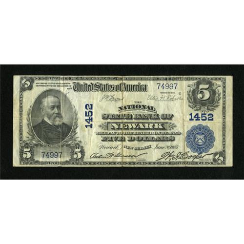 <B>Newark, NJ</B></I> - $5 1902 Plain Back Fr. 598 <B>The National State Bank</B></I> Ch. # 1452<BR> The folds are rather harsh on this still bright New Jersey issue. <B>Very Fine</B></I>.<BR><I>From The John Ameen Collection</B></I><BR><BR><b>Shipping:</b> Coins & Currency (<a target="_blank" href="http://www.heritageauctions.com/common/shipping.php">view shipping information</a>)