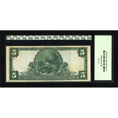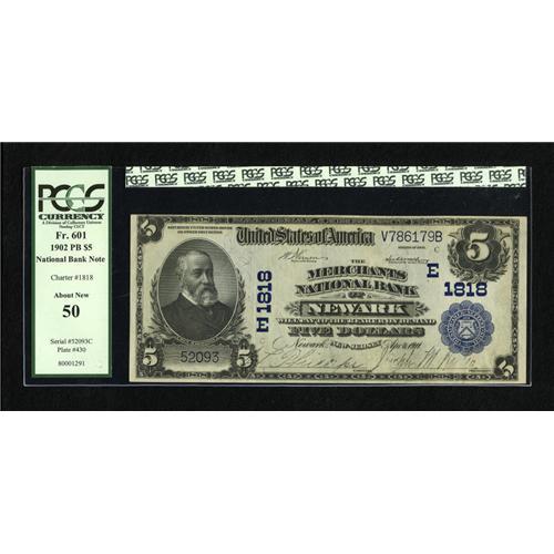 <B>Newark, NJ</B></I> - $5 1902 Plain Back Fr. 601 <B>The Merchants NB</B></I> Ch. # (E)1818<BR>This note features the first of two titles. The paper is pleasing. <B>PCGS About New 50.</B></I><BR><BR><b>Shipping:</b> Coins & Currency (<a target="_blank" href="http://www.heritageauctions.com/common/shipping.php">view shipping information</a>)