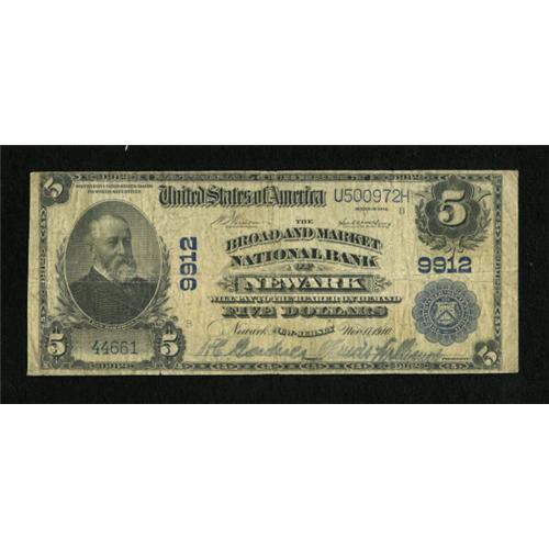 <B>Newark, NJ</B></I> - $5 1902 Plain Back Fr. 601 <B>The Broad & Market NB</B></I> Ch. # 9912<BR> A pleasing <B>Very Good-Fine</B></I> from a bank chartered in 1864 that went on to become one of New Jersey's largest banks. <B>Very Good-Fine</B></I>.<B> <BR></B></I><I>From The John Ameen Collection</B></I><BR><BR><b>Shipping:</b> Coins & Currency (<a target="_blank" href="http://www.heritageauctions.com/common/shipping.php">view shipping information</a>)