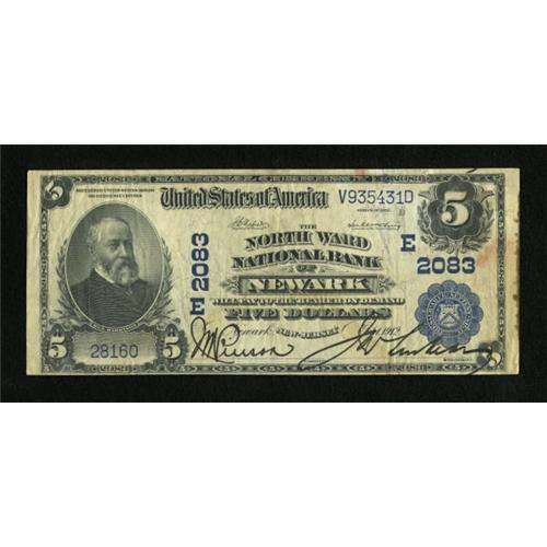 <B>Newark, NJ</B></I> - $5 1902 Plain Back Fr. 602 <B>The North Ward NB</B></I> Ch. # (E)2083<BR> A few stains are noticed on this deeply signed note. <B>Fine-Very Fine</B></I>.<BR><I>From The John Ameen Collection</B></I><BR><BR><b>Shipping:</b> Coins & Currency (<a target="_blank" href="http://www.heritageauctions.com/common/shipping.php">view shipping information</a>)
