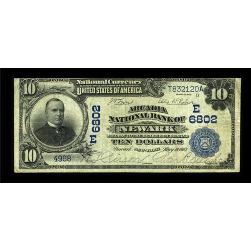 <B>Newark, NY</B></I> - $10 1902 Date Back Fr. 616 <B>Arcadia NB</B></I> Ch. # (E)6802<BR> An evenly circulated Date Back from Newark's second (and last) issuer. <B>Fine,</B></I> trimmed a bit tightly at the top. <BR><I>From The Thomas A. Bergin Collection</B></I><BR><BR><b>Shipping:</b> Coins & Currency (<a target="_blank" href="http://www.heritageauctions.com/common/shipping.php">view shipping information</a>)