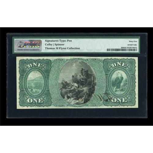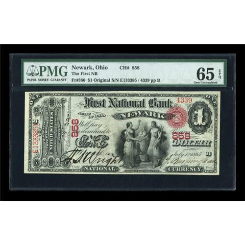 <B>Newark, OH</B></I> - $1 Original Fr. 380 <B>The First NB</B></I> Ch. # 858<BR> The Flynn Collection National Bank Note section starts off with a lovely Fr. 380 which makes a perfect type example. Well centered, bright, original, boldly signed and bearing the coveted EPQ (Exceptional Paper Quality) designation, this beauty has been graded PMG <B>Gem Uncirculated 65 EPQ. </B></I>While Friedberg 380 is hardly a rare number (PMG has already graded 43 of them), only two examples have merited the Gem Uncirculated 65 designation, with only one finer. Expect a realization in the area of...<BR><I>From The Thomas M. Flynn Collection</B></I><BR><BR><b>Shipping:</b> Coins & Currency (<a target="_blank" href="http://www.heritageauctions.com/common/shipping.php">view shipping information</a>)