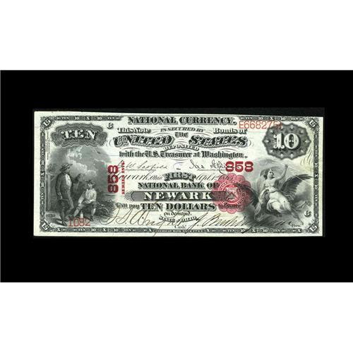 <B>Newark, OH</B></I> - $10 1875 Fr. 419 <B>The First NB</B></I> Ch. # 858<BR>A gorgeous crackling fresh First Charter ten displaying great color and eye appeal. Were the top margin not trimmed in just a bit at the top right this would be a screaming gem. As it lays, it is certainly one of the very nicest Choice examples you are ever likely to see. <B>Choice Crisp Uncirculated.</B></I>