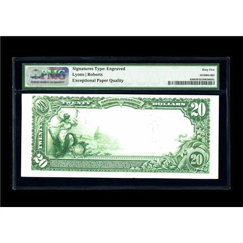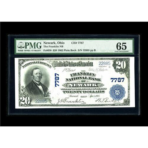 <B>Newark, OH</B></I> - $20 1902 Plain Back Fr. 650 <B>The Franklin NB</B></I> Ch. # 7787<BR>This has to be one of the nicest examples from here known. Bright white surfaces exhibit prominent embossing and vivid inks. Graded <B>Gem uncirculated 65 EPQ</B></I> by PMG.<BR><I>From The Bill and Kathy Stella Currency Collection</B></I><BR><BR><b>Shipping:</b> Coin/Currency (<a target="_blank" href="http://www.heritageauctions.com/common/shipping.php">view shipping information</a>)