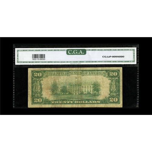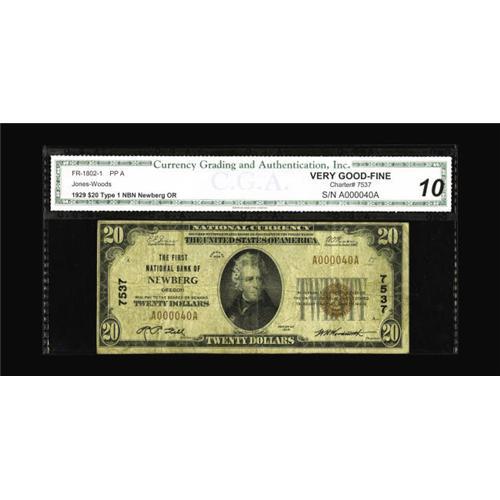 <B>Newberg, OR</B></I> - $20 1929 Ty. 1 <B>The First NB</B></I> Ch. # 7537<BR>Five small size examples make up the census from this well collected west coast bank, a tougher issuer that liquidated in 1935. CGA <B>Very Good-Fine 10.</B></I>