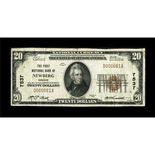 <B>Newberg, OR</B></I> - $20 1929 Ty. 1 <B>The First NB</B></I> Ch. # 7537<BR> A just plain rare bank with just three large and seven small notes comprising the entire census. We sold a considerably lower grade piece back in 2006 for over $1000. This example, which is new to the census, could easily be the nicest Series 1929 specimen known. <B>Very Fine.</B></I><BR><BR><b>Shipping:</b> Coins & Currency (<a target="_blank" href="http://www.heritageauctions.com/common/shipping.php">view shipping information</a>)