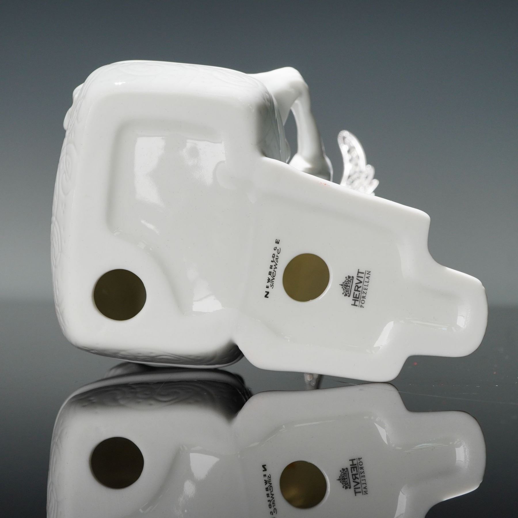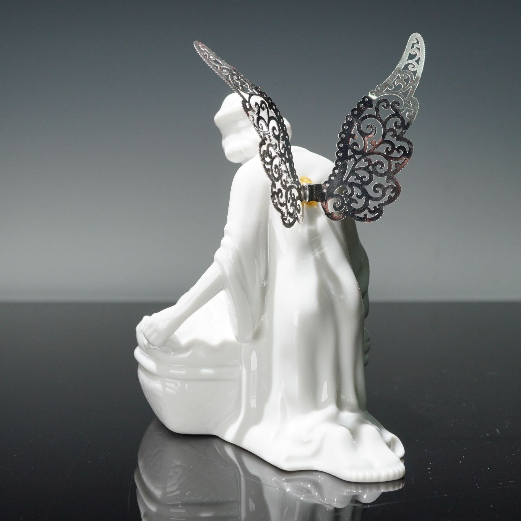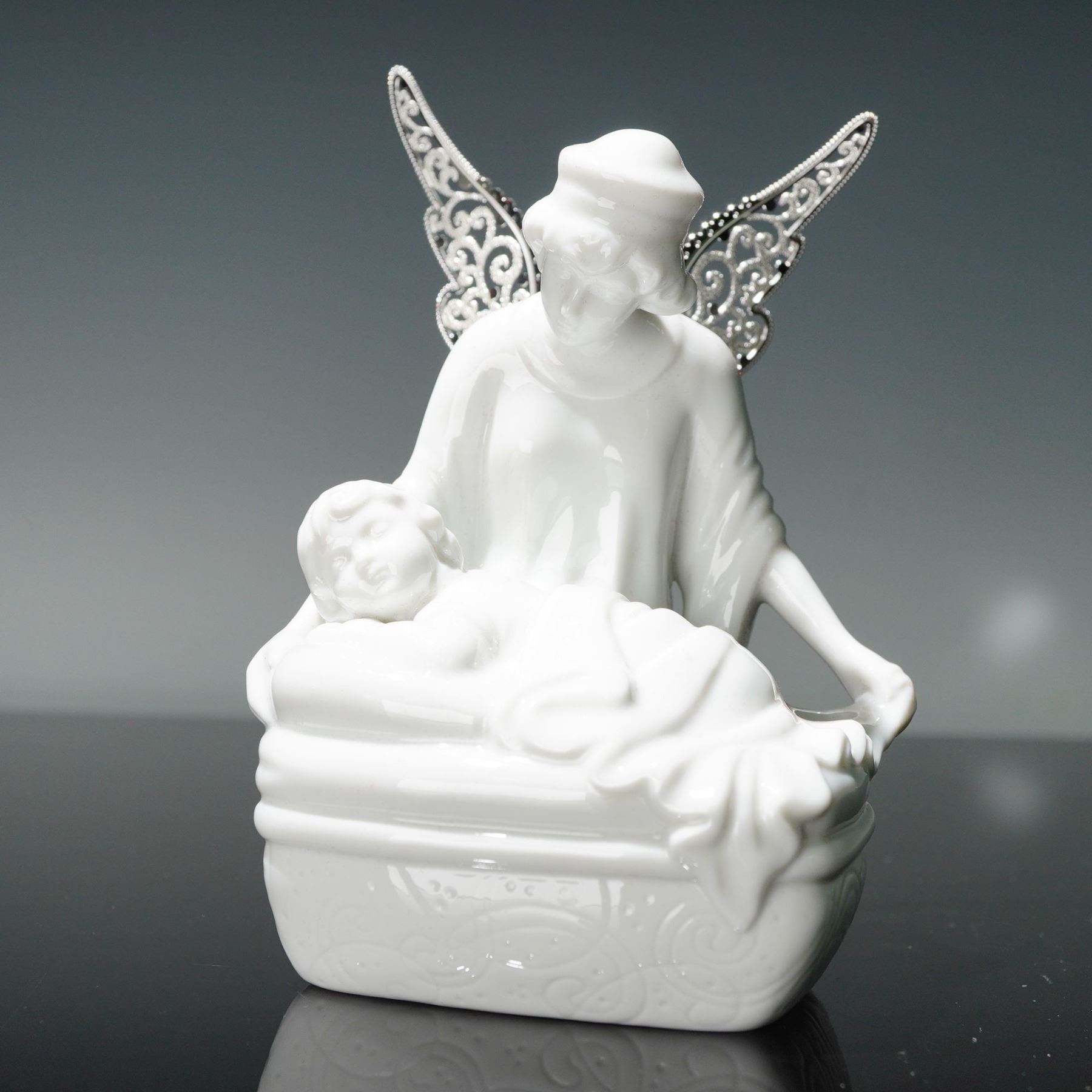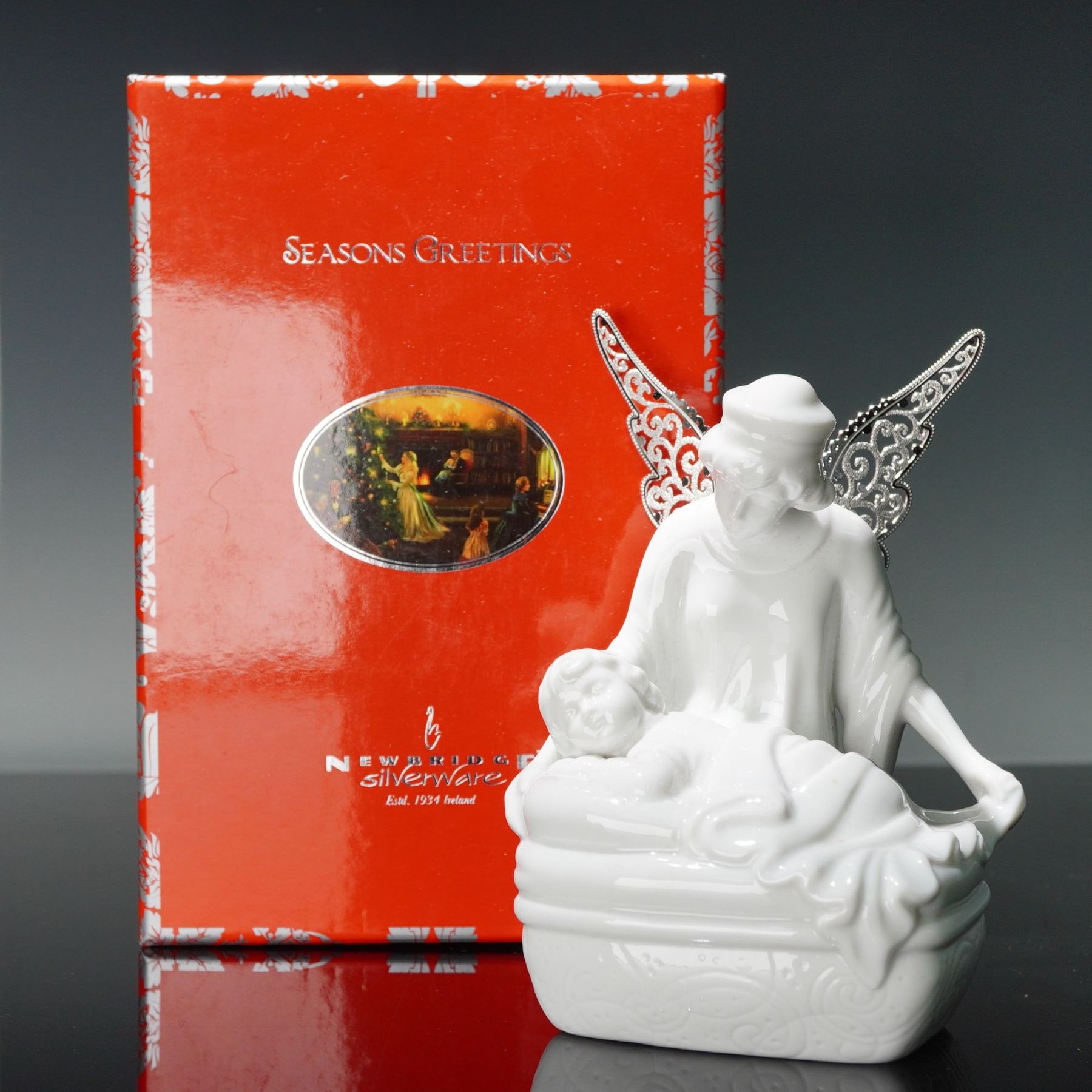 Porcelain figurine depicting a mother and child, designed with intricate silver-tone filigree wings attached at the back. Features an embossed decorative base with an overall glossy white glaze highlighting the sculpted folds and contours. Marked on the underside with the Newbridge Silverware and Hervit Porzellan backstamps. Accompanied by the original red seasonal box.