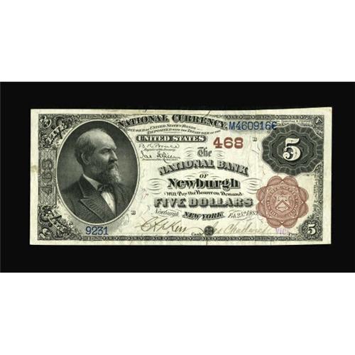 <B>Newburgh, NY</B></I> - $5 1882 Brown Back Fr. 466 <B>The NB of Newburgh</B></I> Ch. # 468<BR> A truly lovely note in all respects, from its fancy layout to its evident eye appeal and from its four large margins to its pen signatures, with the word "Vice" stamped in purple ink in front of the word Pres't." at the signature block. <B>Very Fine-Extremely Fine,</B></I> a $5 Brown Back missing from even the massive Power Collection. <BR><BR><b>Shipping:</b> Coins & Currency (<a target="_blank" href="http://www.heritageauctions.com/common/shipping.php">view shipping information</a>)