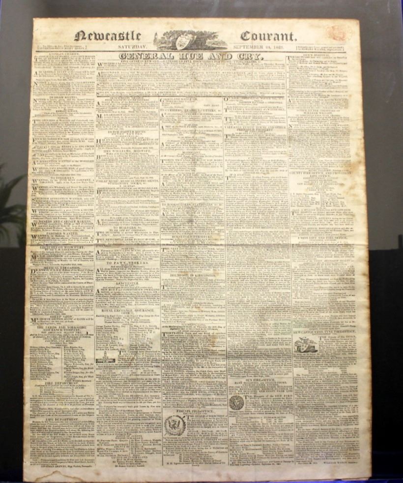 Framed Newcastle Courant Newspaper from September 24, 1825. Excellent Condition for its age.