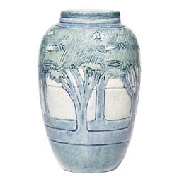 Fine and early Newcomb College vase, tapered shape with a beautifully carved and painted landscape of blue and green trees, executed by Marie De Hoa LeBlanc, #BN54, 5.5”h