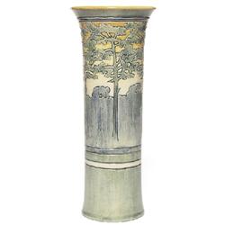 Exceptional Newcomb vase, cylindrical flaring shape with a detailed and finely carved landscape in blue and green against an ivory and orange sky, all covered in a high glaze, nicely executed by Henrietta Bailey, #BN38, 11.25”h