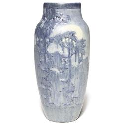 Good Newcomb vase, deeply carved and painted scene of moss laden cypress trees, beautifully executed by Henrietta Bailey, 6.25”h x 3”w, #IY96, very nice example