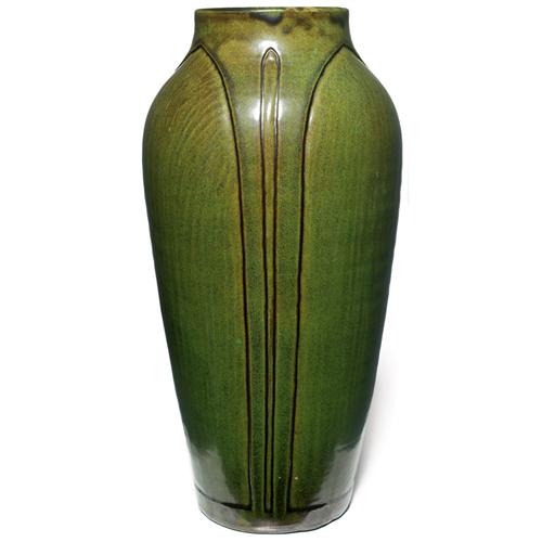 Newcomb vase, large form with incised broad leaf design covered in a multi-toned green matt glaze, signed Harriet Joor, #G96, 15"h, firing chip to foot