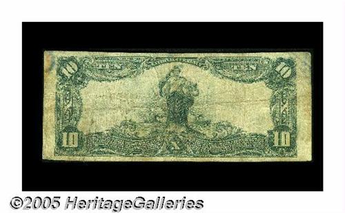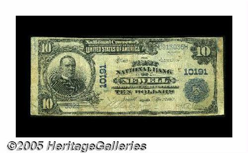 <B>Newell, IA</B></I> - $10 1902 Plain Back Fr. 628 <B>The First NB</B></I> Ch. # 10191<BR>A nice <B>Fine</B></I> from the only bank to issue from this small locale. It ordered Date Backs and Plain Backs only in large before shuttering operations in the Fall of 1933, leaving but $1,950 still circulating of its Third Charter designs. Only four examples are documented in the census. Bid accordingly.