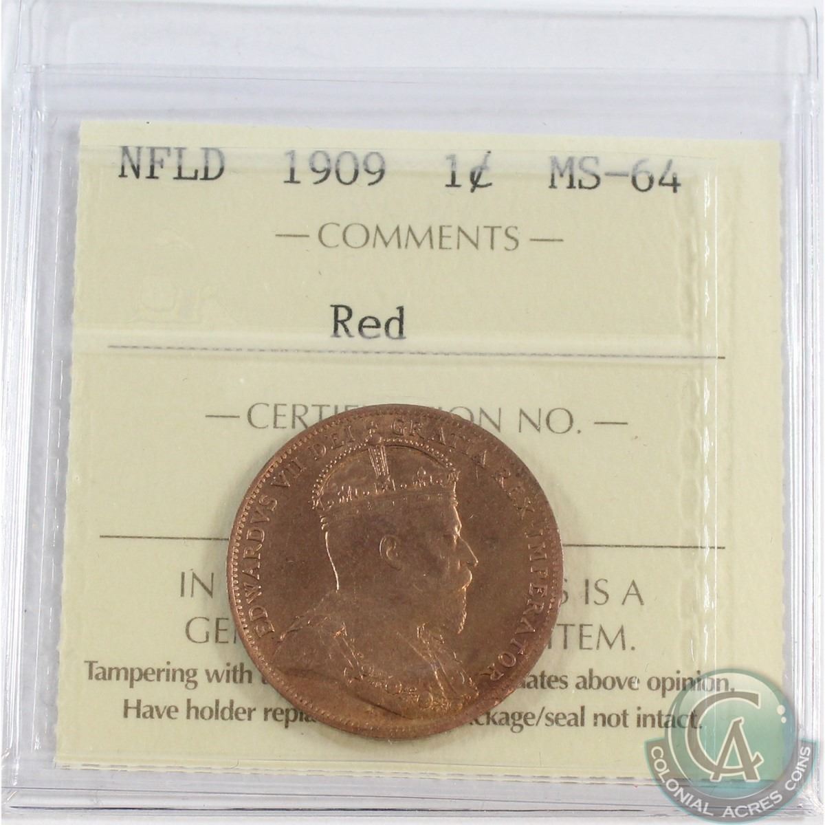 Newfoundland 1-cent 1909 ICCS Certified MS-64 Red! An exceptional strike with full original red fields.