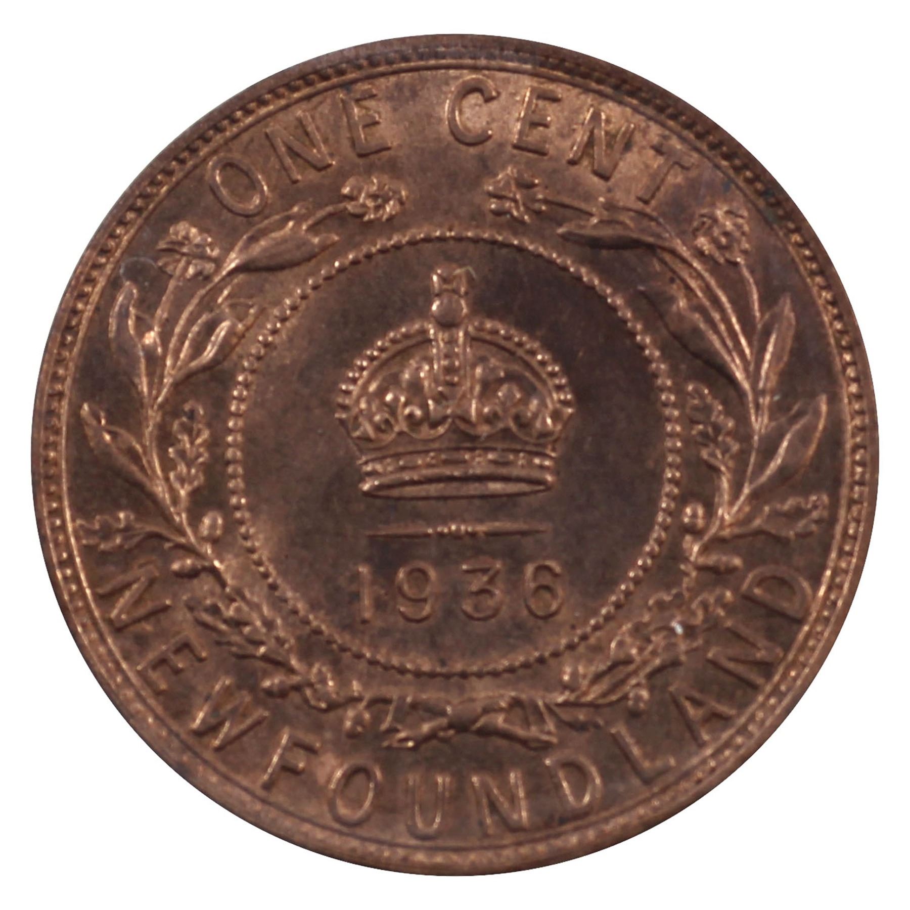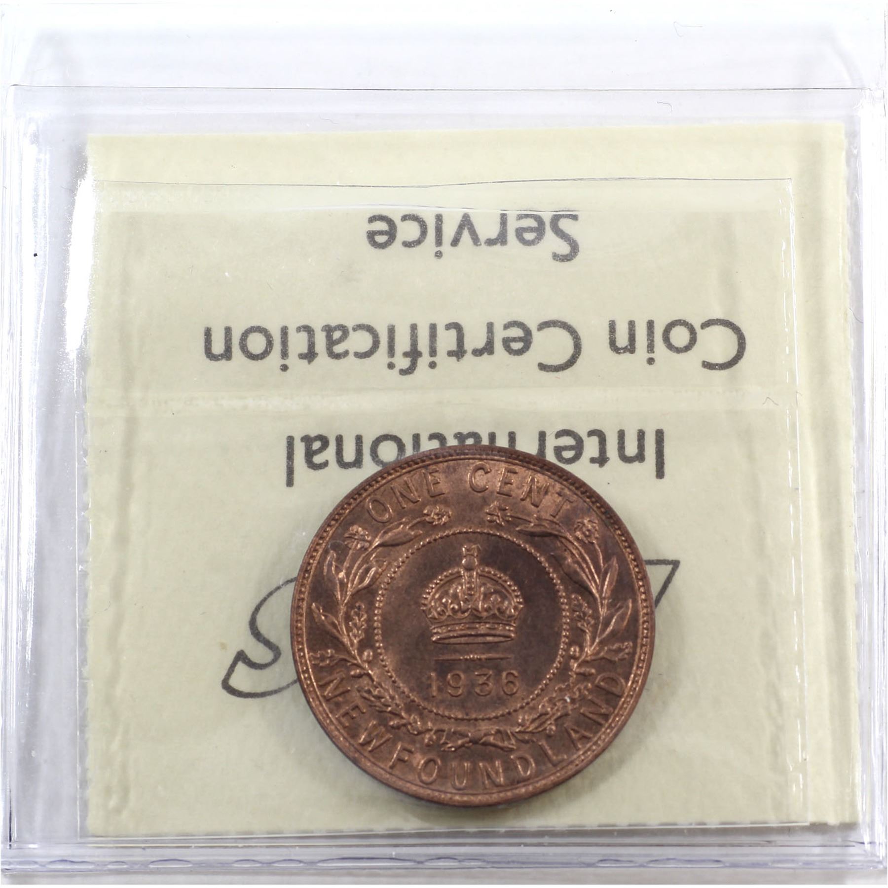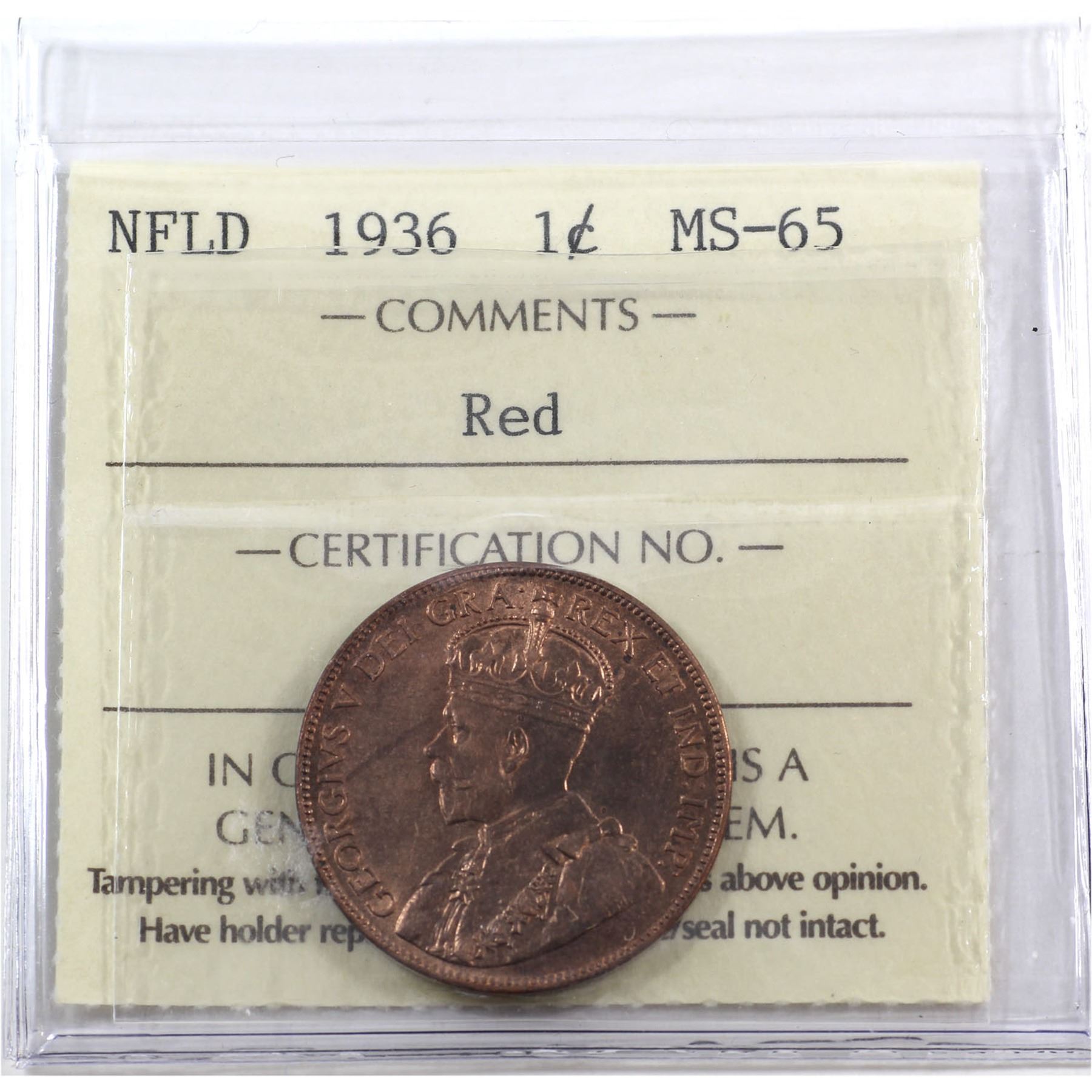 Newfoundland 1-cent 1936 ICCS Certified MS-65 RED. Deep Cherry red tones on lustrous fields.