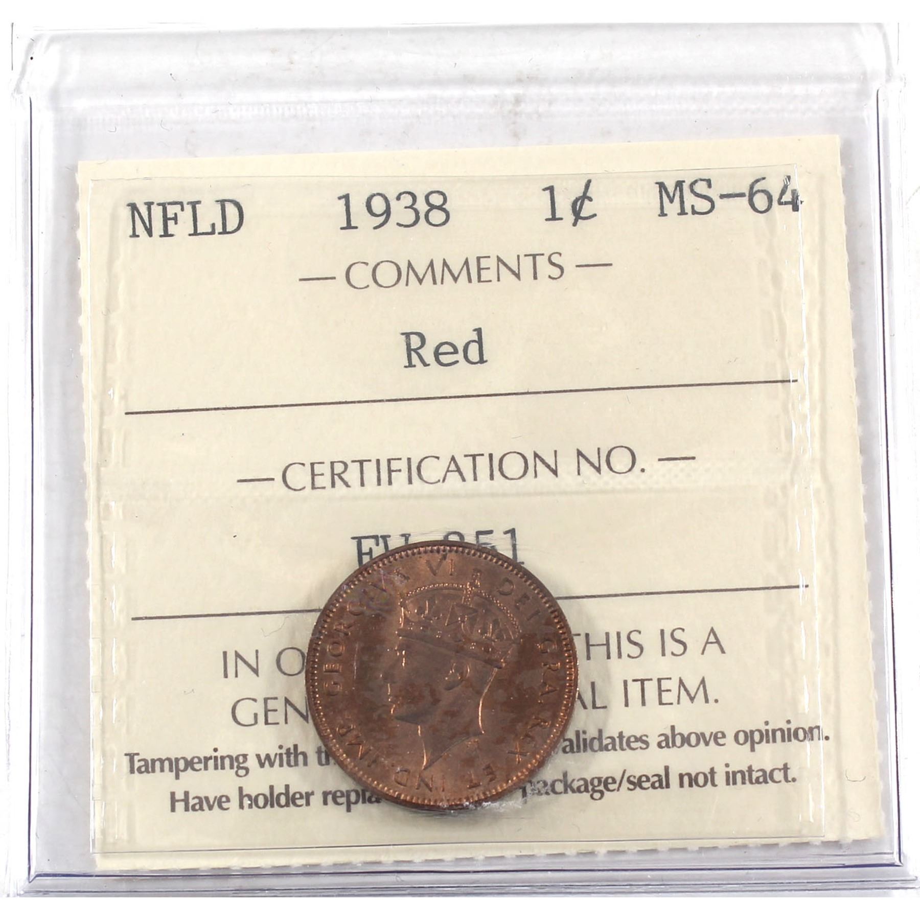 Newfoundland 1-cent 1938 ICCS Certified MS-64 RED!