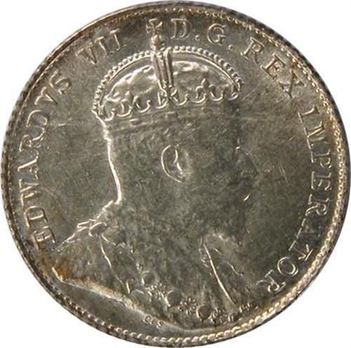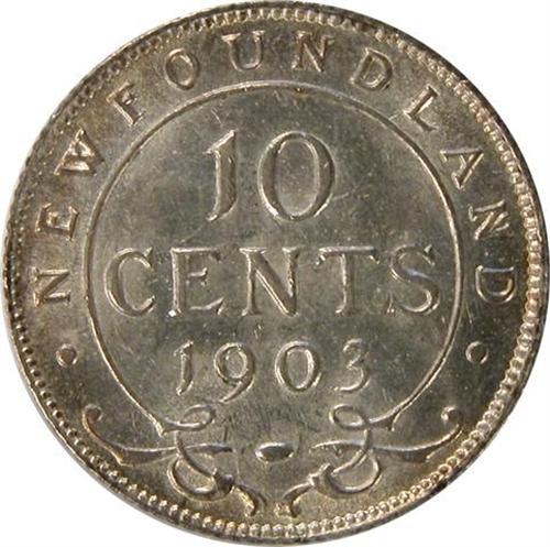 Newfoundland Ten Cents 1903 ICCS MS-60. This is a near fully struck piece with strongly lustrous surfaces that are attractively toned in pale golds. Extremely rare in mintstate, it is one of only two examples certified by ICCS, the other being the MS-62 example from the Mason Collection. This piece was previously sold as Lot 546 in our June 2005 Torex Auction