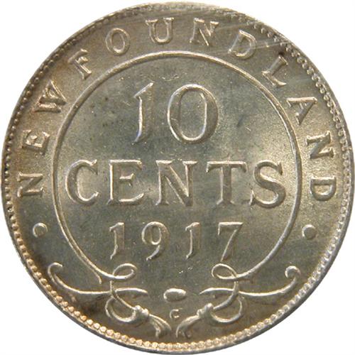 Newfoundland Ten Cents 1917C ICCS MS-63. This is a fully struck piece with great lustre and rather flawless pale golden toned surfaces. It is tied as the fourth highest graded by ICCS
