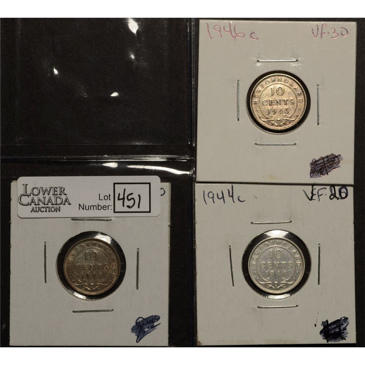 Newfoundland 10 Cents 1941C EF-40, 1944C VF-20 & 1946C VF-30. Lot of 3 coins.