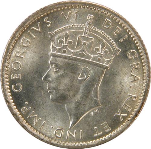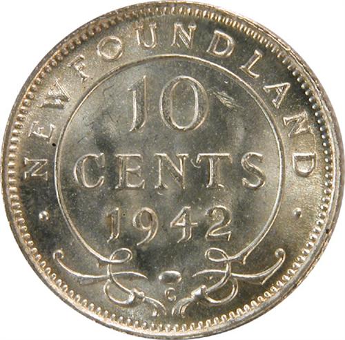Newfoundland Ten Cents 1942C ICCS MS-64. A rather flawless, pale golden toned piece that is tied with two others as the third highest graded by ICCS