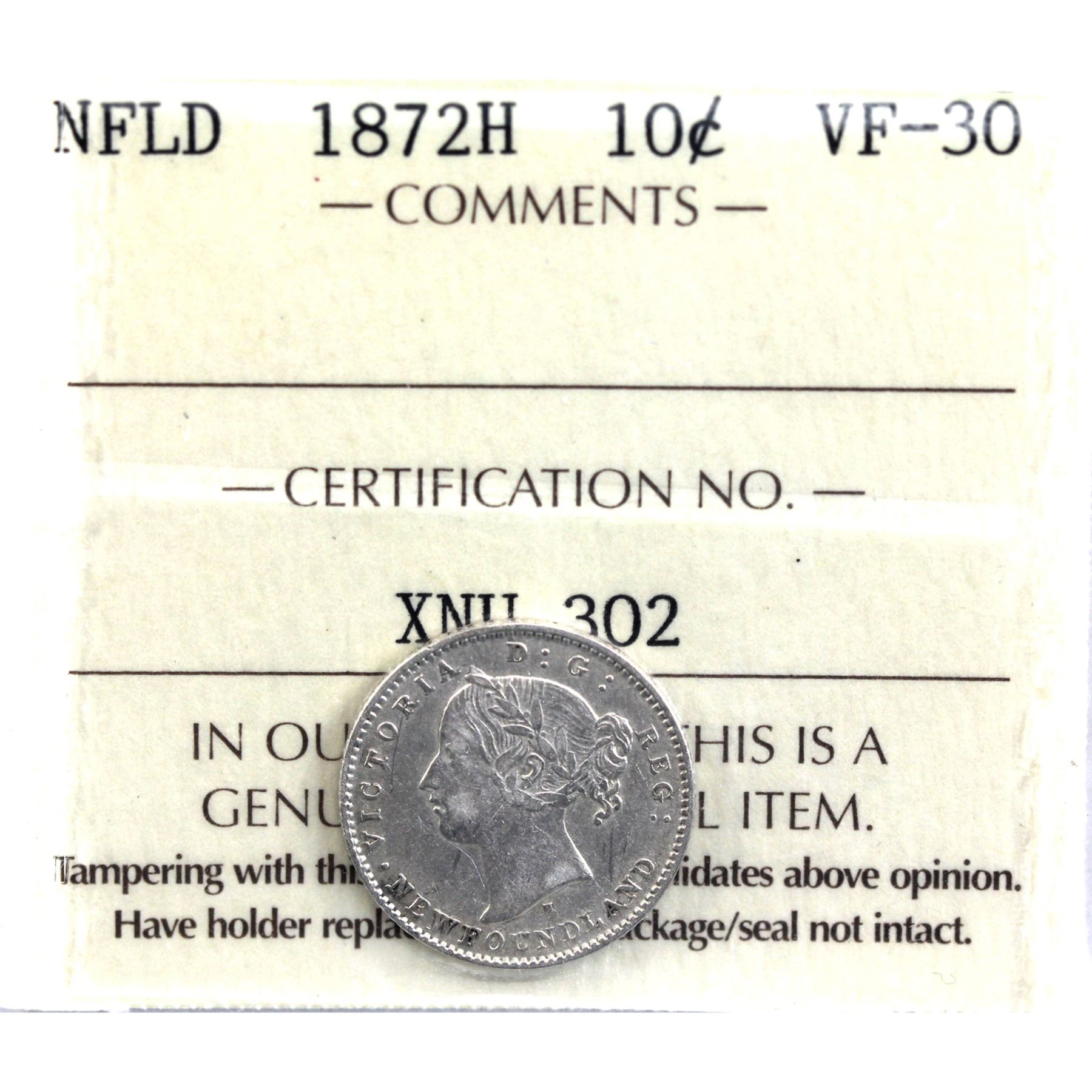 Newfoundland 10-cent 1872H ICCS Certified VF-30.
