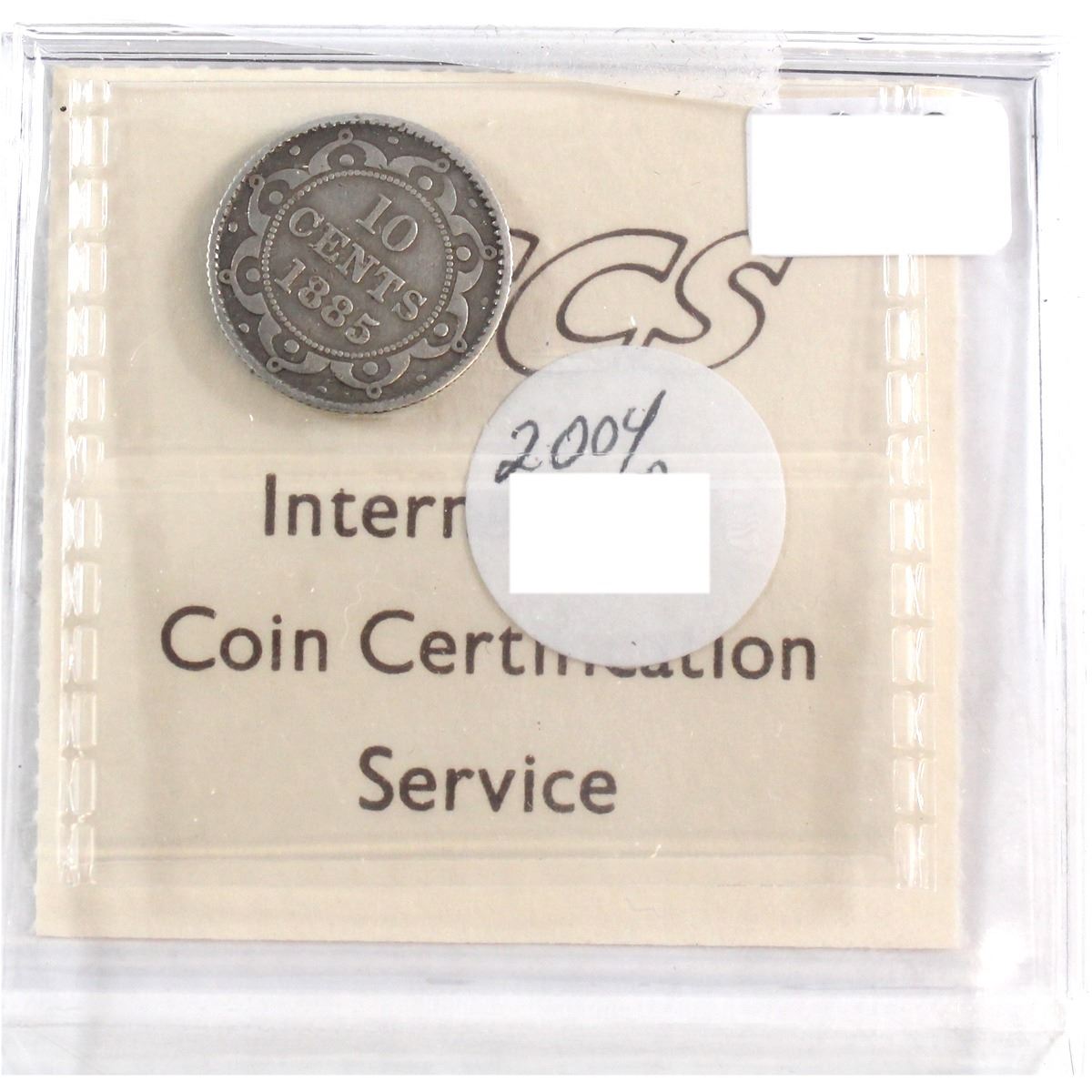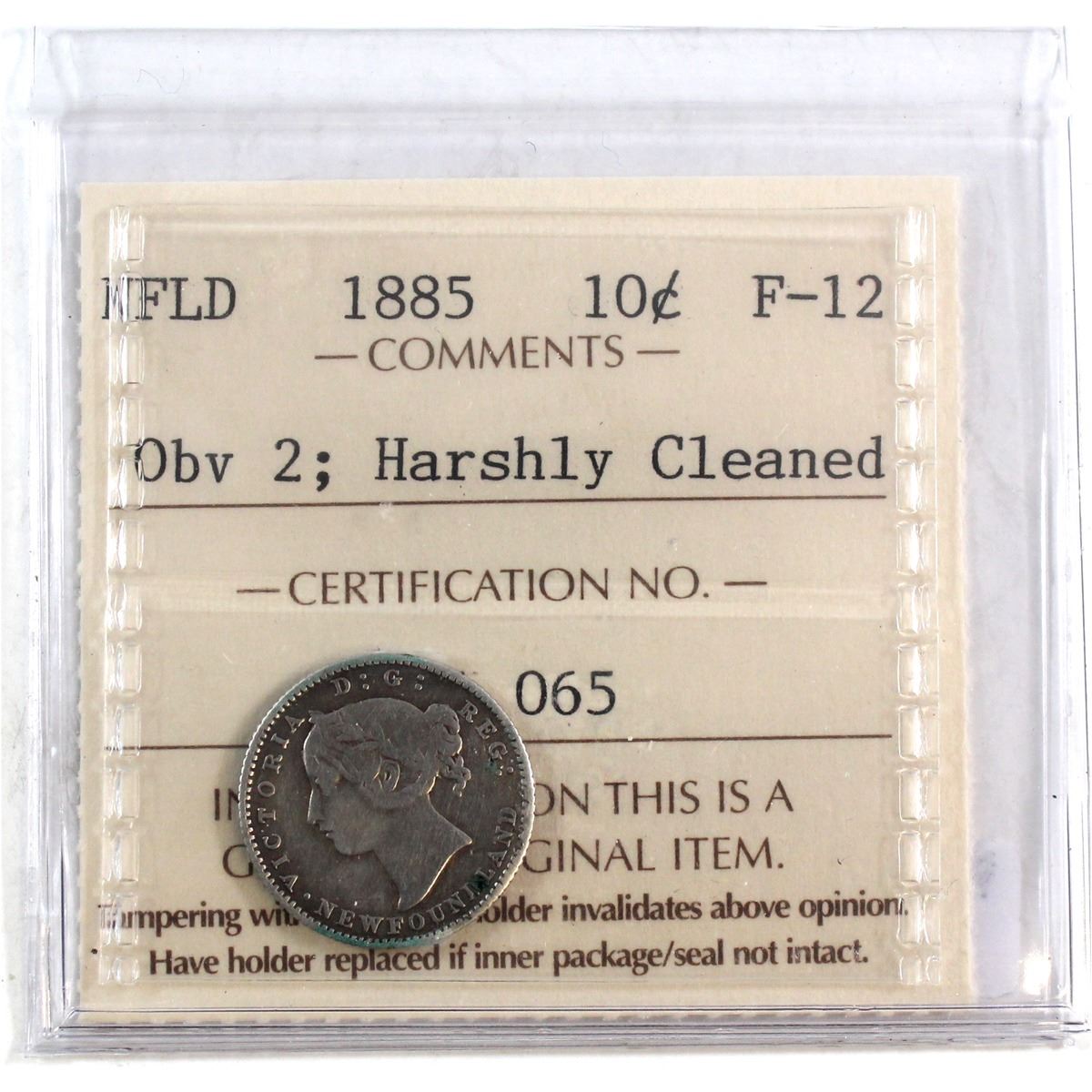 10-cent 1885 NFLD Obv. 2; ICCS Certified F-12 (Harshly Cleaned). Coin has a soft glow, no major scratches or marks.