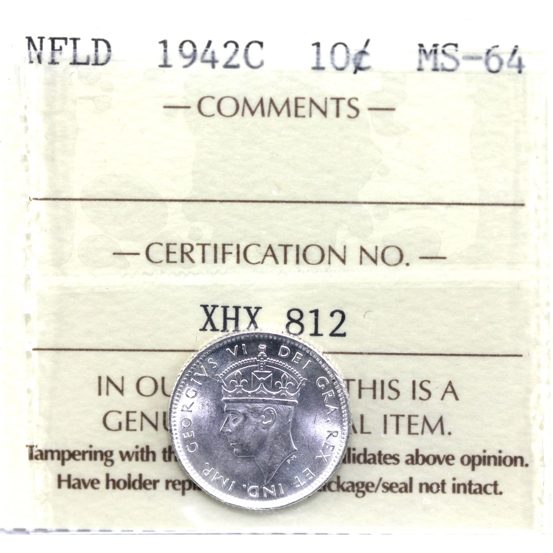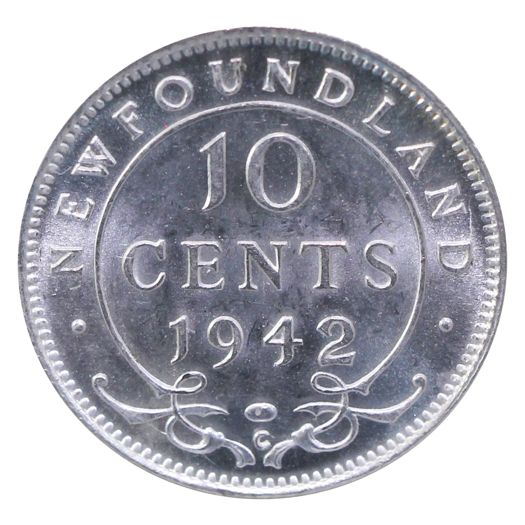 Newfoundland 10-cent 1942C ICCS Certified MS-64. Frosted white coin.