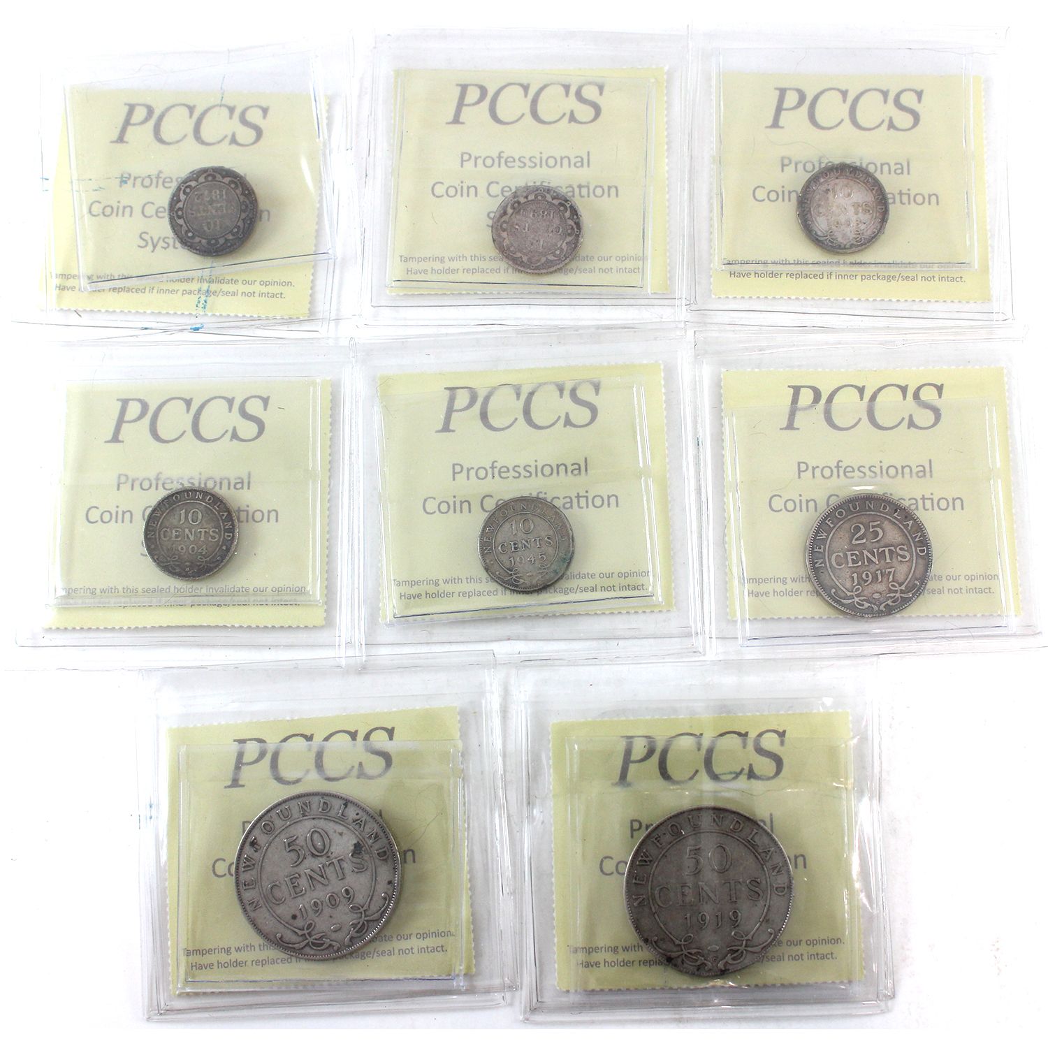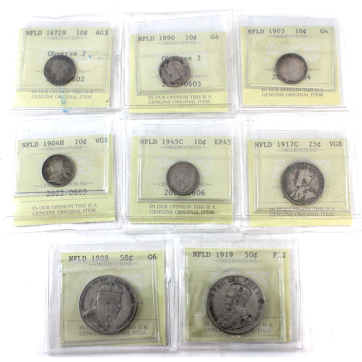 Newfoundland 10-cent, 25-cent & 50-cent 1872-1945 PCCS (Professional Coin Certification System). You will receive 10-cent 1872H Obv 2 AG3, 1890 Obv 3 G4, 1903 G4, 1904H VG8, 1945C EF45, 25-cent 1917C VG8, 50-cent 1909 G6 & 1919 F12. Note some holders contain elastic residue. 8pcs