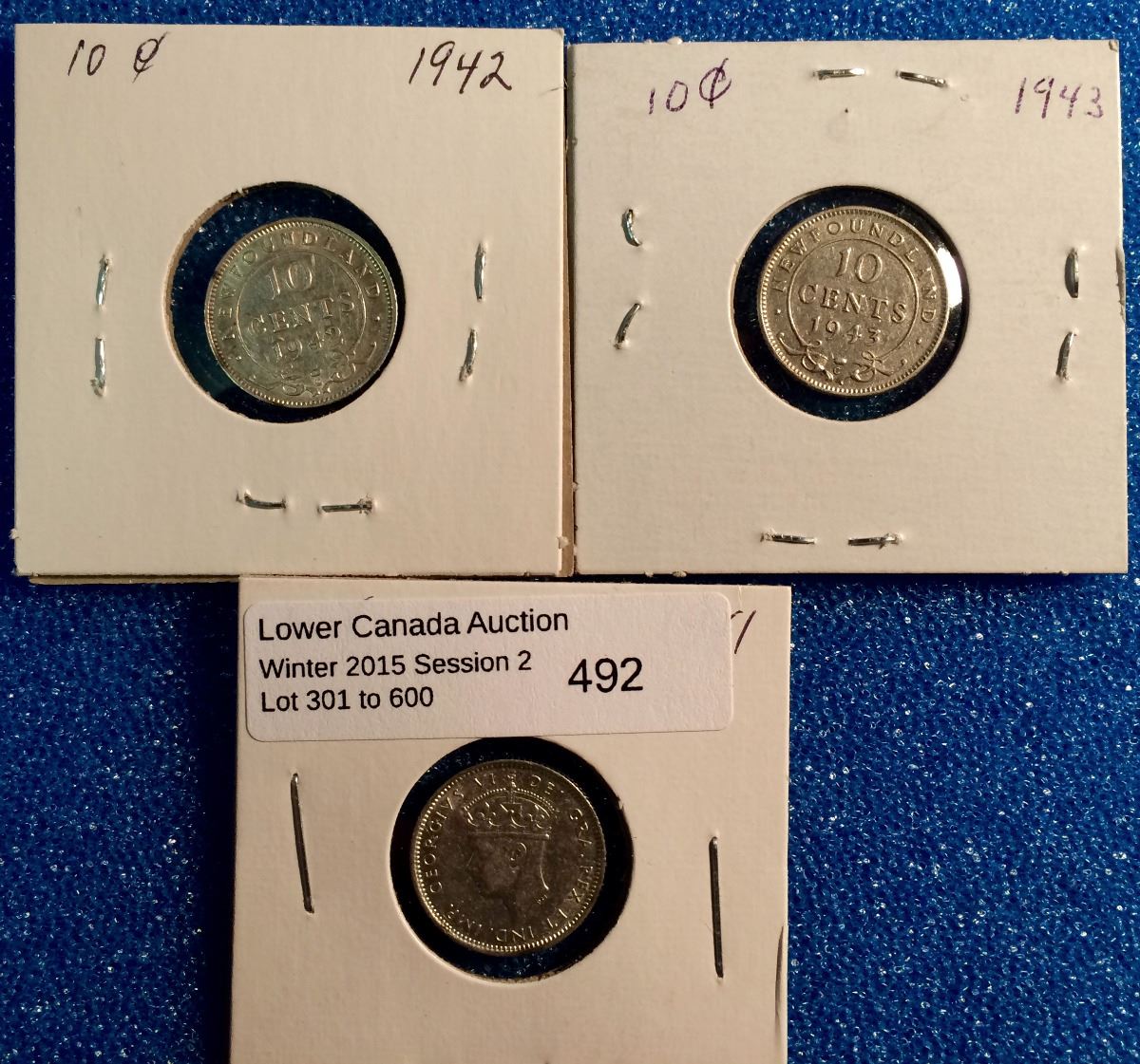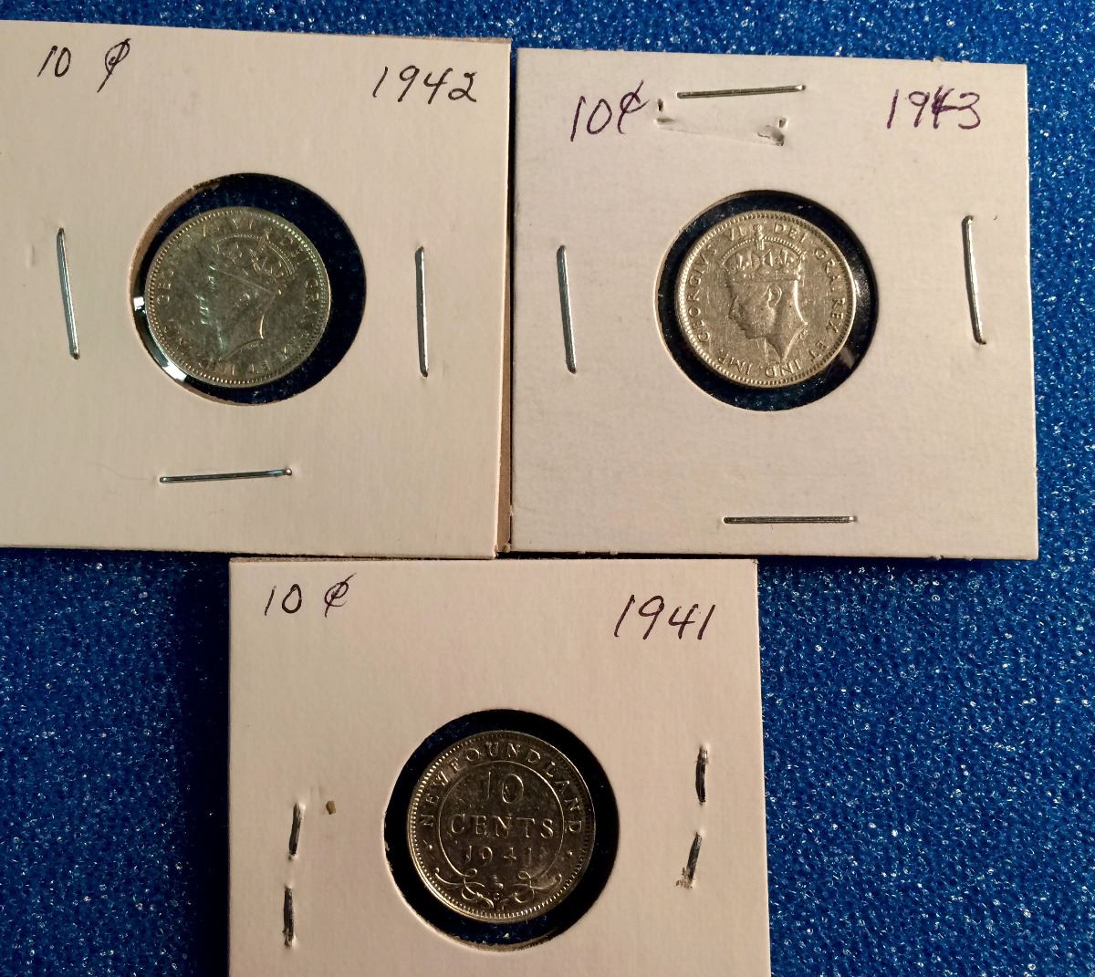 Newfoundland 10 cents 1941C EF-40, 1942C EF-40 and 1943C VF-30. Lot of 3 coins.